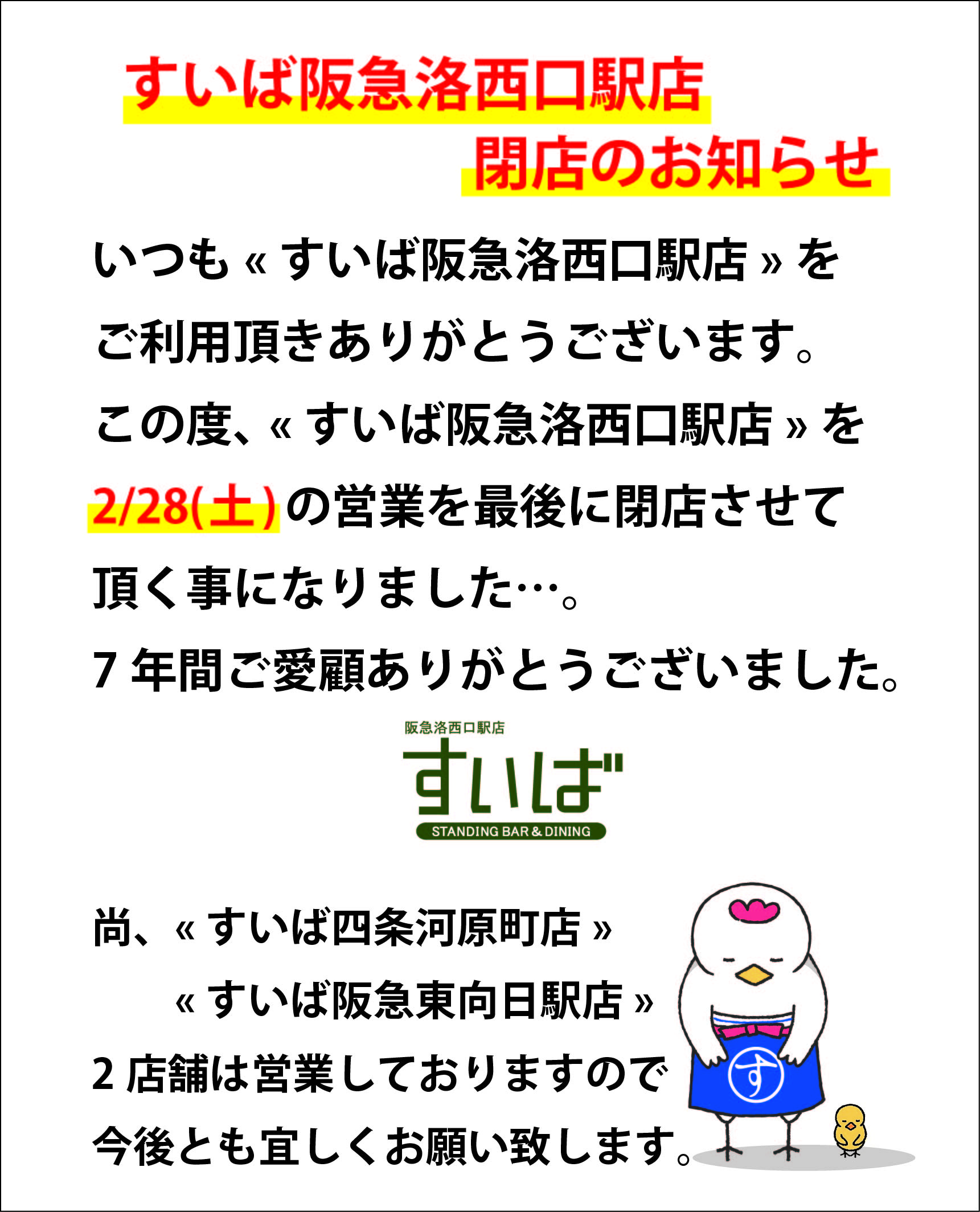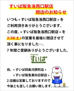 お知らせ 2026.01.20 【すいば阪急洛西口駅店のおしらせ】 いつも«すいば»をご愛顧いただき誠にありがとうございます。 この度«すいば阪急洛西口駅店»は誠に勝手ながら2026年2月28日をもって閉店させていただくことになりました。 7年間、多くのお客様にご来店いただき、温かいご支援とご愛顧を賜りましたこと心より御礼申し上げます。 残り2月28日まで«すいば阪急東向日駅店»は休みなく営業させていただきますので宜しくお願い致します。 なお «すいば四条河原町店» «すいば阪急東向日駅店» は今後も営業しておりますので、 宜しくお願い致します。 前の記事へ