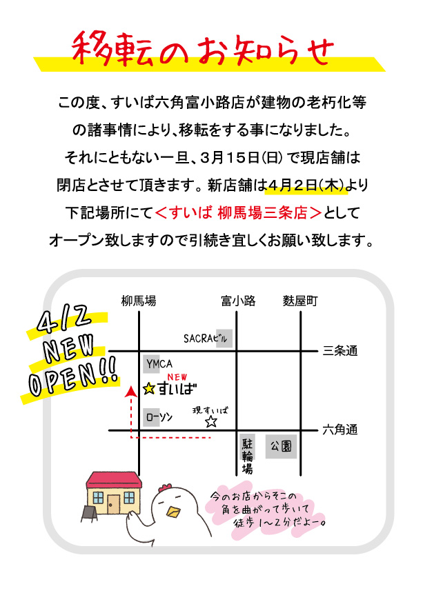 お知らせ 2020.03.04 【六角富小路店】よりお知らせ いつも「すいば」をご利用頂きありがとうございます。 この度、すいば六角富小路店が建物の老朽化等の諸事情により移転をする事になりました。 それにともない一旦、3月15日(日)をもちまして一時休業させて頂きます。 皆様のおかげで約6年間今の場所で営業させて頂くことが出来ました! 誠にありがとうございます。 新しい場所での営業は、4月2日(木)オープンの予定です。 【すいば柳馬場三条店】として、また新たに頑張って参りますので引続き宜しくお願い致します。 前の記事へ 次の記事へ