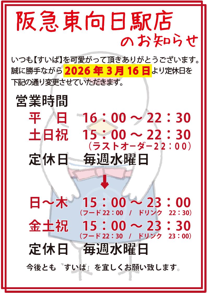 お知らせ 2026.03.12 «すいば阪急東向日駅店»のお知らせ いつも«すいば»をご利用いただきありがとうございます。 2026年3月16日より«すいば阪急東向日駅店»の営業時間が変わります。 少しだけですが営業時間が延びますので皆様にゆっくりと«すいば»時間を楽しんでいただければと思います。 今より皆様と会える時間が伸びることスタッフ一同楽しみにしております♪ 前の記事へ