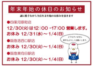 お知らせ 2025.12.22 年末年始のお知らせ いつも«すいば»をご利用いただきありがとうございます。 2025年も残りわずかとなりました。 誠に勝手ながら今年も年末年始はお休みさせていただきます。 «すいば»各店の年末年始の営業は ●すいば四条河原町店 12月30日は17:00まで営業しております♪ 12月31日~1月4日お休みさせていただきます。 ●すいば阪急洛西口駅店 12月30日~1月4日お休みさせていただきます。 ●すいば阪急東向日駅店 12月30日~1月4日お休みさせていただきます。 前の記事へ