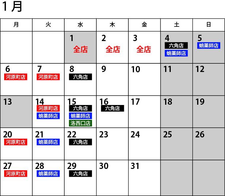 お知らせ 2019.12.23 1月の店休日のお知らせ※一部変更がございます。 今年も残り僅かですが皆様いかがお過ごしでしょうか? 1月の各店舗の店休日は下記の通りです。来年もどうぞ宜しくお願い致します。 ※年末年始により通常と営業時間・店休日が異なりますのでご注意ください。 前の記事へ 次の記事へ