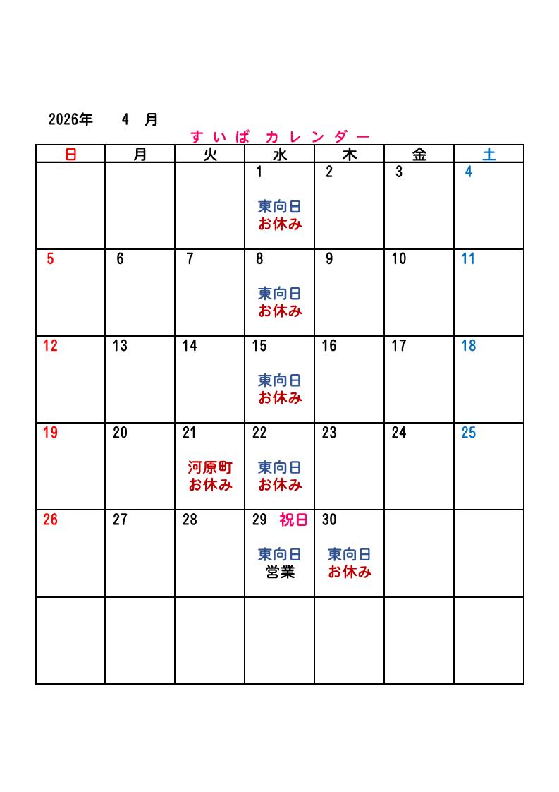 お知らせ 2026.04.02 4月すいば各店のお休みです♪ いつも«すいば»をご利用いただきありがとうございます。 4月すいば各店のお休みです♪ 一部、祝日に定休日が重なった為、変更しております。 «すいば四条河原町店» 定休日は毎月第3火曜日ですm(_ _)m «すいば阪急東向日駅店» 定休日は毎週水曜日ですm(_ _)m 4月は29日(水)の祝日に営業させていただき 30日(木)にお休みさせていただきます。 各店、皆様のご来店お待ちしております。 前の記事へ